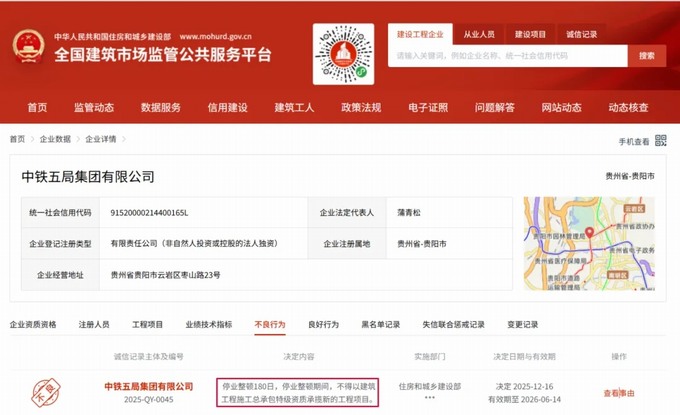 可能吗?住建部处罚中铁五局!要求停业整顿180天