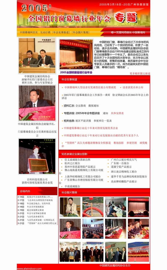 协会成立之初,年会只是以工作会议形势出现,会议以传达政府工作精神,总结年度工作,布置工作计划为主题,会议内容空洞枯燥。现在的“年会”已经形成了我们铝门窗幕墙委员会独特的会议方式,会议内容有四大部分,认真贯彻国家、建设部对行业发展的有关精神,总结经验,落实今后行业的发展工作;组织大型的新产品展示会;组织国内外最新的学术交流会议专题技术讲座等多项大型活动,把“年会”办好办活,办成名副其实的行业信息平台。
