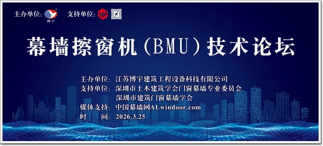 2026年3月25日下午,由江苏博宇建筑工程设备科技有限公司主办,深圳市土木建筑学会门窗幕墙专业委员会、深圳市建筑门窗幕墙学会共同支持的“粤港澳大湾区擦窗机(BMU)技术论坛”在深圳益田威斯汀酒店三楼露台宴会厅隆重举行。