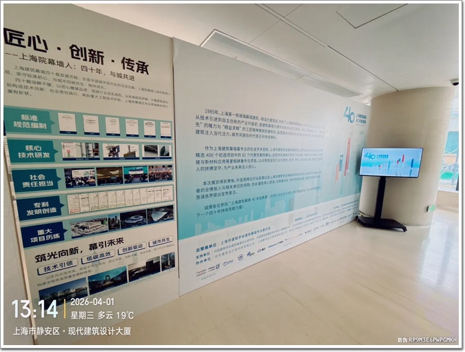 献礼——收官之作!2026年4月1日由上海市建筑学会学术指导,上海市建筑学会建筑幕墙专业委员会与上海建筑设计研究院有限公司(以下简称“上海院”)联合承办的“上海建筑幕墙40年成果展上海院巡展”在上海市石门二路258号「上海院」北楼会议室隆重开幕,同期“设计之外系列技术论坛”也如火如荼的举办。