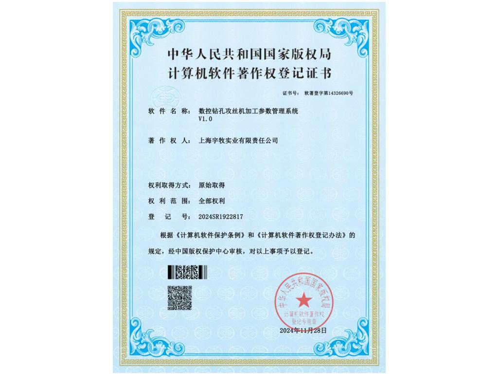 数控钻孔攻丝机加工参数管理系统专利证书