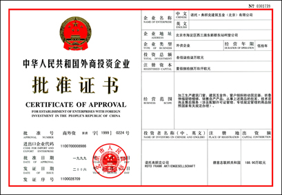 外资企业批准证书 |