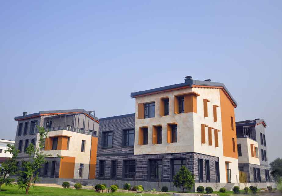 示范建筑总建筑面积4013㎡,地上建筑面积2313㎡,地下建筑面积1700㎡,其中地上部分由4栋580㎡的独栋建筑构成,地下部分相互连通。