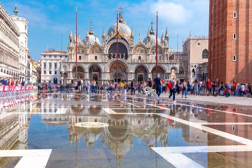 威尼斯的圣马可大教堂是最受欢迎的景点之一。玻璃防护墙保护着这座建筑免受洪水造成的损害。