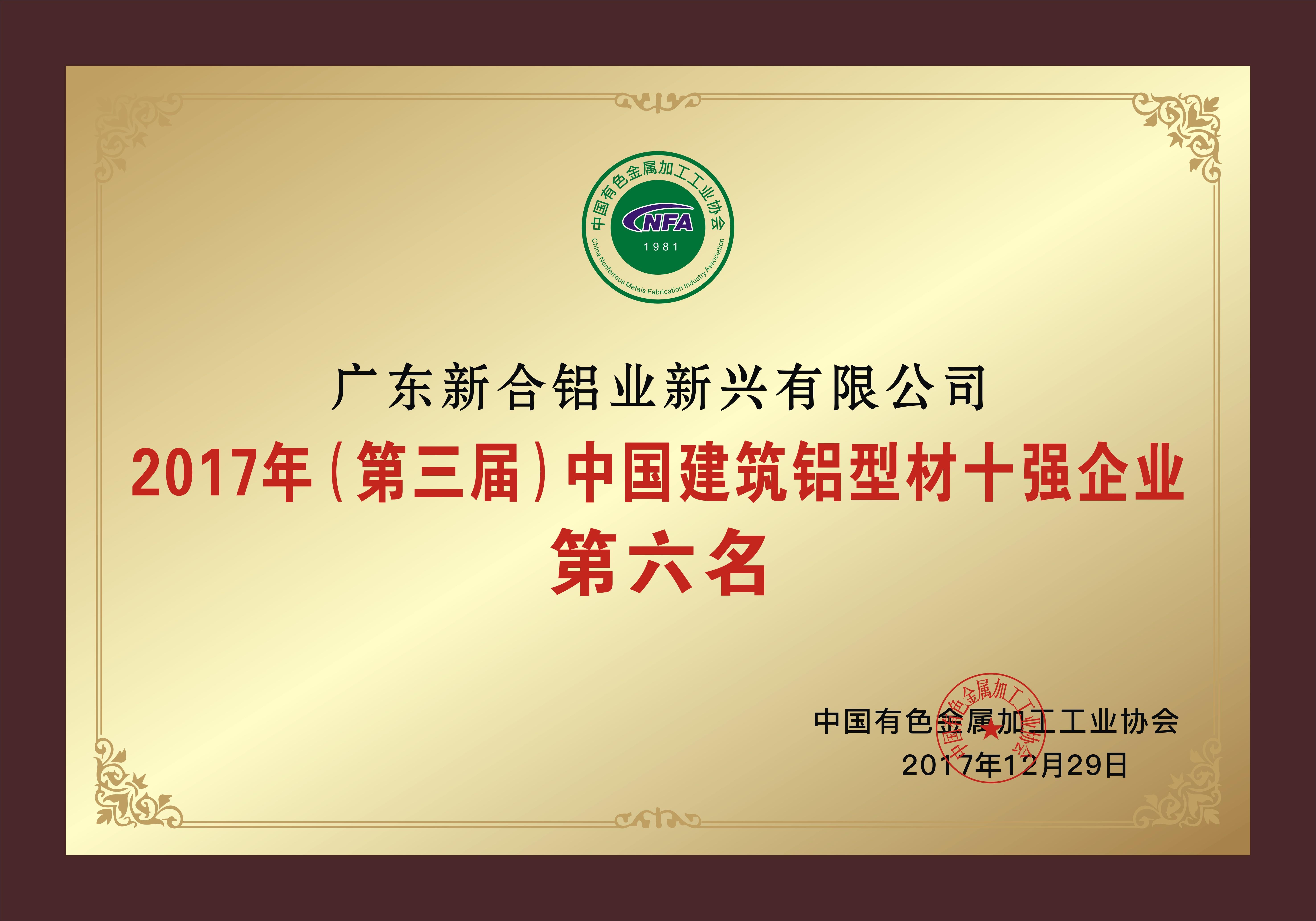 证书名称: 中国建筑铝型材十强企业