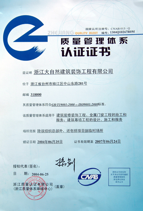 质量管理体系认证证书 |