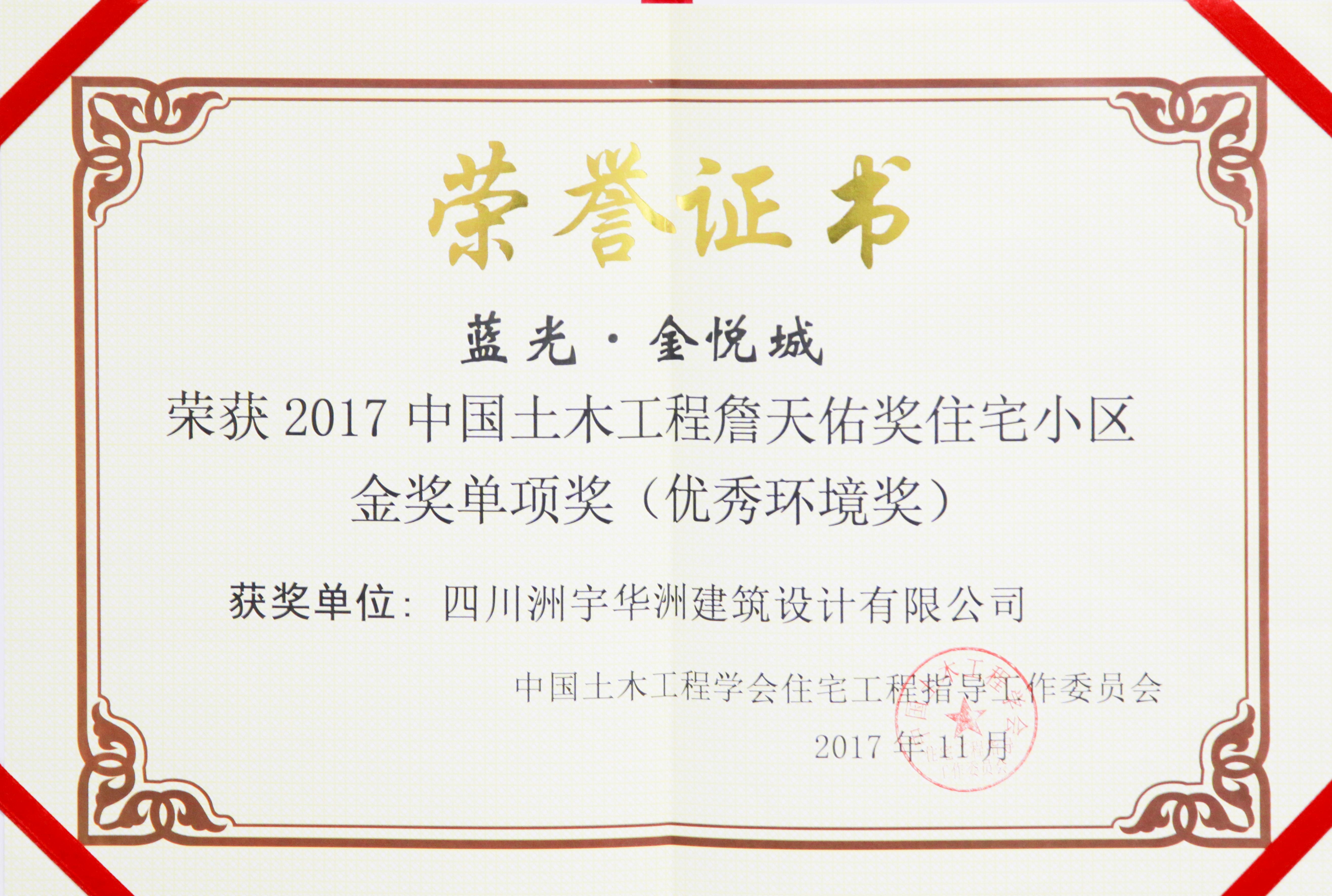 蓝光·金悦城2017中国土木工程詹天佑奖住宅小区金奖单项奖(优秀环境奖)