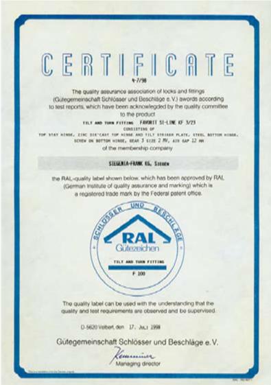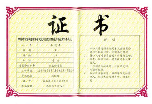 中国建筑金属结构协会建筑门窗配套件委员会副主任委员证 |