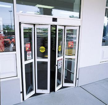 1.1定义 由各种信号控制自动启闭、并具备运行装置、感应装置及门体部件的总称。(感应伸缩门详见室外大门。) 1.2分类 1)按启闭形式分:可分为推拉门、平开门、折叠门和旋转门 (1)推拉门:可细分为单开、双开、重叠单开、重叠双开和弧形门。弧形门门扇沿孤形轨道平滑移动,可分为半弧单向、半弧双向、全弧双向。为了最大限度的拓宽入口幅度,有的推拉(套叠)自动门可作成在开启终点与固定扇重合后一道手动平开,也归纳为推拉自动门。 (2)旋转门:可细分为有中心轴式、圆导轨悬挂式和中心展示区式等。 (3)平开门:可细分为单扇单向、双扇单向、单扇双向和双扇双向。 (4)折叠门:可细分为2扇折叠和4扇折叠。 应用统计:推拉自动门用量最大,约占4种类型自动门总量的90%以上,其次是旋转自动门,约占6%左右,平开和折叠自动门用量最少,各约占2%左右。 2)按门体材料分:有安全玻璃、不锈钢饰面、建筑铝合金型材、彩色涂层钢板、木材等,也可采用其它材料。用其组成的常见种类有无框玻璃自动门、不锈钢框玻璃自动门和铝合金框(刨光或氟碳喷漆)玻璃自动门。 3)按感应装置分 动体感应型:对速度大于50㎜/s的物体产生感知的感应装置。 静体感应型:对速度小于50㎜/s的物体产生感知的感应装置。 除柔垫式和接触型感应装置外,其余均为非接触型感应装置。 4)按运行装置分:有电动式、气动式、液压式和组合式。