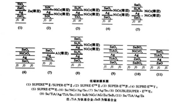 低辐射膜(Low-E) 镀膜玻璃是表面镀有低辐射膜系的镀膜玻璃,其膜系结构有多种,如图2