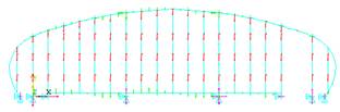 在索网结构支撑钢结构体系计算中,选取整体结构进行空间有限元分析,在计算中其边界条件假定为:支撑钢结构与屋面钢结构及主体土建结构考虑为铰接,约束x及y两个方向线位移,结构自重在计算时导入,计算时,与索网体系考虑整体模型进行计算,支撑钢结构