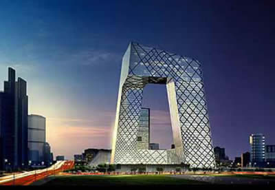 央视新厦由两个巨大的“Z”形钢结构交叉缠绕,两座不同形态的塔楼在三维上构成了奇特的关联。一片由钢铁与玻璃组成的云,中间是一个巨大的洞,穿过洞看到了更多的楼、蓝天、太空。央视新厦这座别具一格、标新立异的“Z”形钢结构建筑,造型独特、表达新奇,类似一个巨型城市雕塑的作品。展示中央电视台的崭新形象,推动中国高层建筑结构体系和结构思想的创新和发展。