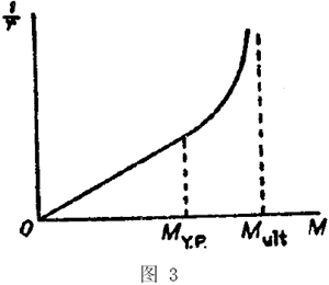 运用式3-4式和3-5式,我们可将弯矩m与曲率1/r的关系表示为如图3所示.在M-MY.P以前的变形为弹性变形,梁的曲率与弯矩按正比增大.当M增大至MY.P以上时,m与1/r的关系就变成非线性.当塑性变形的深入深度e趋近于h/2时,相应的应力分布则趋近于如图2e所示.
