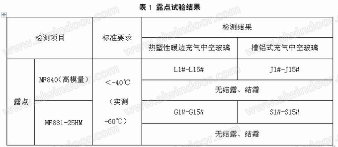中空玻璃的露点上升是由于外界的水份进入间隔层又不被干燥剂吸收造成的。露点的高低则直观地反映中空玻璃质量的好坏,是检测中空玻璃的性能指标之一。按国家标准GB/T 11944-2012中7.3规定的方法进行,试验结果见表1: