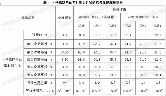 由表8可知,热塑性暖边中空玻璃按照GB/T 11944-2012中7.7气体密封耐久性试验要求进行5倍循环之后,其气体浓度的含量均≥80%,满足中空玻璃GB/T 11944-2012标准要求;气体年泄漏率均≤1.00%,满足EN1279-3:2018标准要求,耐循环老化性能较好。