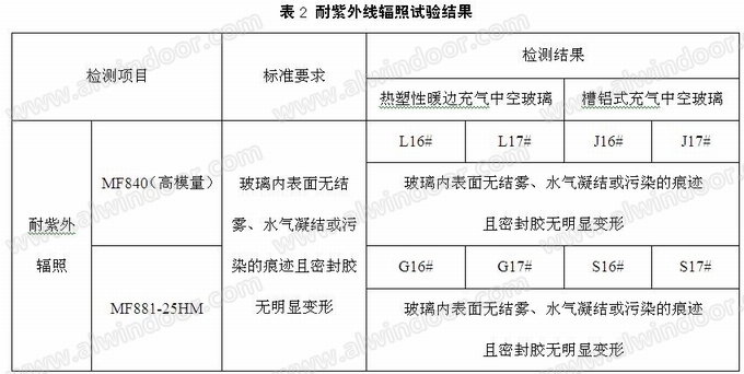 此项指标是考察制成的充气中空玻璃在紫外线照射下的性能变化,检测密封胶的紫外稳定性,测试充气中空玻璃用密封胶中是否含有影响视线的有机挥发物。按国家标准GB/T 11944-2012中7.4规定的方法进行,试验结果见表2: