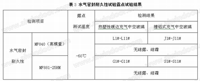 具体试验按GB/T 11944-2012中7.5规定的方法进行,试验结束后测试充气中空玻璃的露点。实验结果见表3: