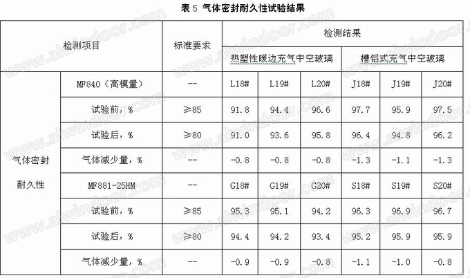 综合表4、表5、表6和表7试验结果可知,热塑性暖边充气中空玻璃水气密封耐久性和气体密封耐久性性能较好,满足国家标准GB/T 11944-2012和欧洲标准EN 1279-2018要求。