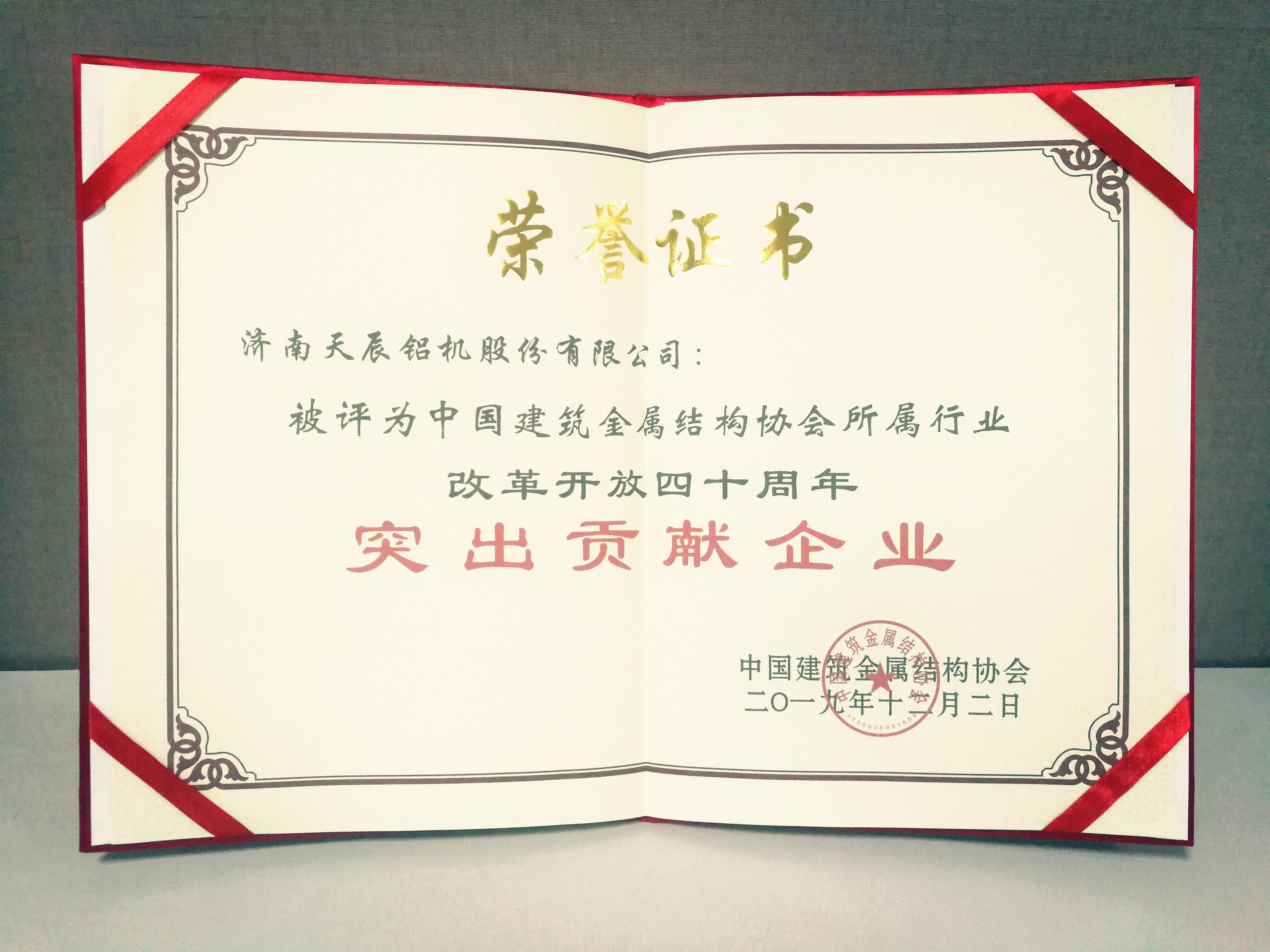 | 2019年12月2日,中国建筑金属结构协会第十一次会员代表大会暨第十一届理事会一次会议在北京胜利召开。会议特别表彰了改革开放四十周年“行业功勋奖”、“新锐人物奖”、“突出贡献企业”、“精准扶贫和行业活动先进单位"获奖的个人和单位,鼓励会员单位企业共筑门窗幕墙行业未来发展。 天辰股份被评为 【中国建筑金属结构协会所属行业改革开放四十周年“突出贡献企业”】。