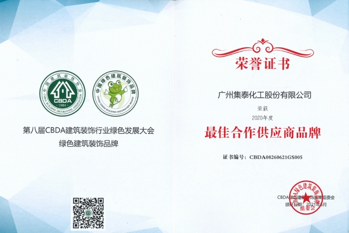 同时,在6月26日,由中国建筑装饰协会主办,天津市环境装饰协会协办的第八届CBDA建筑装饰行业绿色发展大会在天津国家会展中心盛大召开,集泰股份以优异的产品质量、稳定的供应机制和完善的服务体系,得到行业肯定,荣获2020年度“最佳合作供应商品牌”称号。