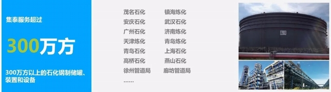 中国建筑装饰行业绿色发展大会自2014年开始,已成功举办了七届,是我国绿色建筑装饰行业的高端、权威交流平台,为推动行业绿色创新、促进行业沟通交流、提升企业品牌价值、宣传行业成就,履行社会责任,发挥了积极的作用,成为建筑装饰行业一年一度的绿色品牌盛会。 此次集泰股份荣膺双项大奖,充分体现了行业对“集泰漆”、“安泰胶”的认可,将进一步夯实公司子品牌的市场美誉度,增强企业核心竞争力。 12年防腐涂装经验 服务客户超过200家 自2009年水性漆通过中石化科技成果鉴定,集泰水性防腐漆开始全面推广。从集装箱到钢结构、石化设备领域,集泰防腐涂料积累了丰富的经验。截止目前,公司已为超过200家钢结构客户、超过1000个钢结构项目,以及超过300万平方的石化储罐、管道管线和装置设备,提供安全、健康、环保的产品。