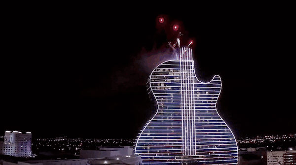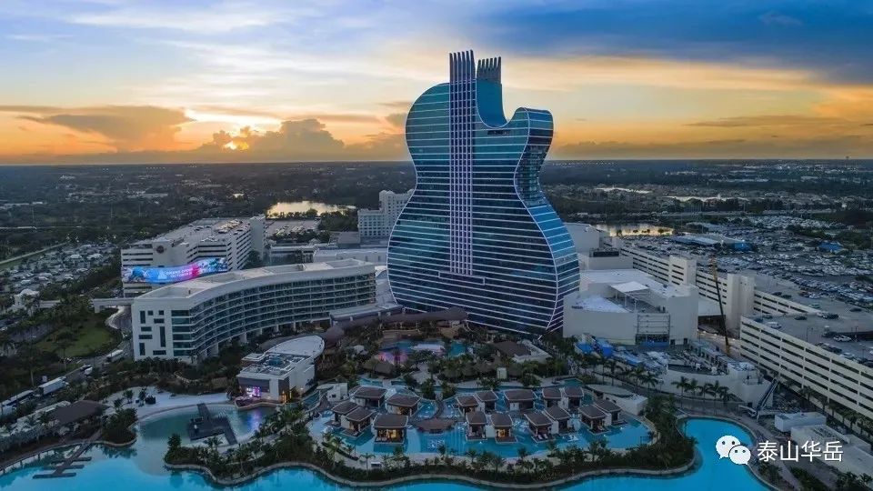 | 全球首栋吉他大厦位于佛罗里达州好莱坞的塞米诺尔硬石酒店及赌场是物业扩张的一部分,估计耗资15亿美元,共36层,这座400英尺高的吉他形酒店非常引人注目。 吉他造型,配合灯光、烟花、音乐,更强的带入感,置身其中留恋往返,吸引万千游客蜂拥而至,使酒店成为体验性的中心和南佛罗里达州的照明建筑信标。 在酒店进行盛大开幕之际,是由来自蒙特利尔的创意机构Float4与DCL视觉传达设计公司共同为开幕仪式设计了独特的霓虹灯光秀。将400英尺高的外墙变成了LED墙,并配备了230万个LED灯,视频地图和激光。将每天进行两次灯光表演,其叙述和主题向音乐对Hard Rock故事的重要性致敬。 ▼酒店全景overlook to the hotel