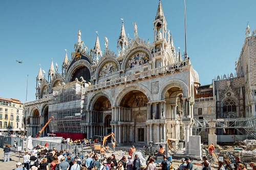 威尼斯的圣马可大教堂是最受欢迎的景点之一。玻璃防护墙保护着这座建筑免受洪水造成的损害。