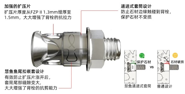 慧鱼全新推出的石材背栓FZPS,融合创新设计理念与多项专利技术,进一步巩固了慧鱼在国内背栓领域的领先地位。这款背栓不仅彰显了慧鱼在幕墙行业的持续创新和进步,更为客户提供了更高效、更安全的幕墙解决方案,帮助项目提升整体性能和安全性。