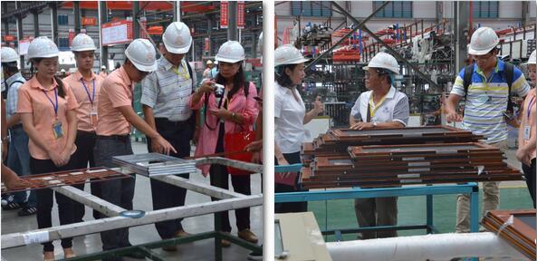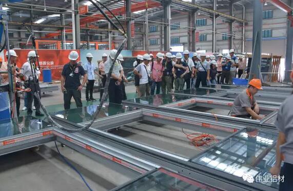 炎炎夏日丝毫没有影响来访团的热情,他们在惊叹如今行业飞速发展的同时,积极提问,伟业工作人员也结合相关专业知识逐一作了解答。 随后一行人来到铝厂,参观生产区7000吨挤压机、立式氧化电泳生产线、全自动立体仓库、企业技术中心、伟业展示中心等。从铝材到门窗、到铝家居等,绿色铝建筑系统产业链,在场的台湾业内代表均对集团的建设成果表示赞许。 集团副总经理李伟萍为参访团讲解伟业展示中心风格馆门窗产品