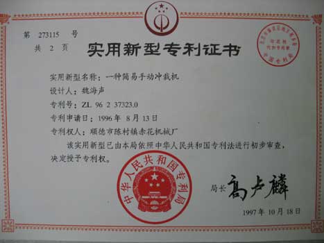 一种简易手动冲裁机实用新型专利证书 |