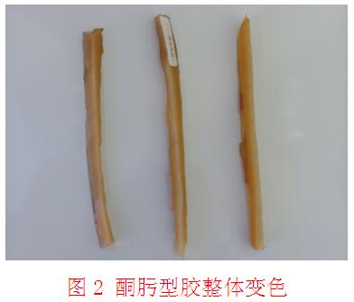 酮肟型的密封胶在酸性环境下,会发生整体变色。比如酮肟型的密封胶的胶条旁边打一段酸性密封胶的胶条,一段时间后,就会出现变色。图2是酮肟型的密封胶在室内装饰的酸性环境下出现了整体变色,同时,我们在室外发现该密封胶没有变色。