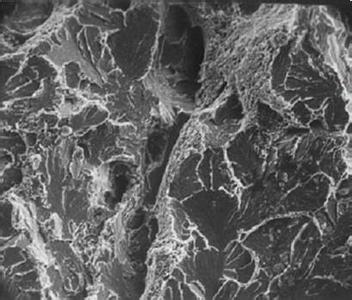 准解理断裂是淬火加低温回火的高强度钢较为常见的一种断裂形式,常发生在脆性转折温度附近。准解理断裂的断口是有平坦的“类解理”小平面、微孔及撕裂棱组成的混合断裂。 特征 准解理断裂(quasi-cleavage fracture)介于解理断裂和韧窝断裂之间;在不同部位产生解理裂纹核,扩展成解理刻面,最后以塑性方式撕裂。河流花样短而弯曲,支流少,解理面小,且周围有较多的撕裂棱。 由裂源向四周扩散,不连续,局部扩展;准解理小平面位相并不与解理面严格对应。 宏观断口形貌比较平整,但微观形貌有河流花样,舌状花样及韧窝与撕裂棱等。 在大量高密度短而玩去的撕裂棱线条、点状裂纹源由准解理断面中部向四周放射的河流花样、准解理小断面与解理面不存在确定的对应关系、二次裂纹等。 产生原因 (1)、从材料方面考虑,必为淬火加低温回火的马氏体组织,回火温度低,易产生此类断裂。 (2)、构件的工作温度与钢材的脆性转折温度基本相同。 (3)、构件的薄弱环节处处于平面应变状态。 (4)、材料的晶粒尺寸比较粗大。 (5)、回火马氏体组织的缺陷,如碳化物在回火时的定向析出。 预防措施 为了防止此类断裂最有效的办法就是提高钢材的抗低温脆断能力,即千方百计地降低钢材的脆性转折温度(如细化晶粒,减少组织缺陷等),在这方面与预防解理断裂的措施是基本相同的。 其他补充 |