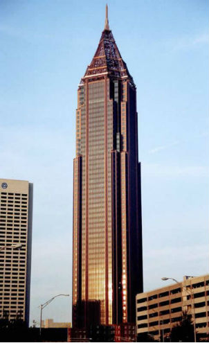 联邦银行大厦(又被称为图书馆大楼、第一州际世界中心)位于美国加州洛杉矶市中心西五街633号。它是整个北美地区在芝加哥以西最高的摩天大楼,也是加州的最高楼。除此之外,联邦银行大厦也是顶楼屋顶上有直升机机场的最高大楼(依洛杉矶市建筑法规定兴建)。联邦银行大厦有1018英尺高(310米),名列全球最高摩天大楼之中(2005年资料中排名第二十二位)。在台北101建成之前,联邦银行大厦也是盖在主要地震活动带上的最高楼,建筑物本身被设计成可以抵挡芮氏规模8.3的地震。联邦银行大厦共73层楼高,还有两层地下停车场,是由贝聿铭建筑事务所的建筑师Henrey N. Cobb所设计,总共耗资三亿五千万美金兴建。 第二十四名:亚特兰大 美国银行广场
