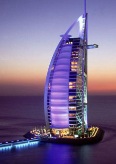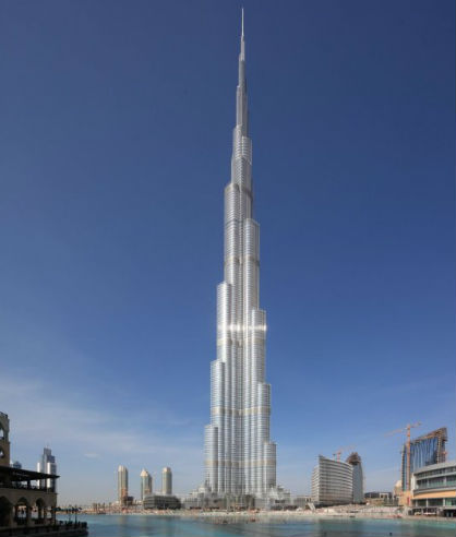 许多古代统治者为自己建造了纪念物,20世纪早期的摩天大楼被看作为是现代与之差不多的一类东西。这些建筑用来炫耀的权势和财富。 克莱斯勒大厦就是受克莱斯勒汽车制造公司的创建者沃尔特•P•克莱斯勒的委托著名建筑师范•艾伦而建造的。它建于1926年—1931年,坐落在美国纽约市。它是第一座摩天大楼,高度超过305米。左图:金属鹰滴水嘴从61楼上凝视着下面的街道。沃尔特•P•克莱斯勒要求将它们制成看上去与汽车散热器帽盖的装饰物一样,作为他显赫的汽车制造帝国的标记。实际高度319米,比竞争对手华尔街40号楼282.6米高37米。1930年华尔街40号楼以282.6米的高度超过克莱斯勒大厦,但克莱斯勒大厦加了37米高的金属塔顶,一举成为世界最高的人工构筑物(比埃菲尔铁塔高),11个月后,帝国大厦后发制人,超出了它的高度。 第二十二名:迪拜 阿拉伯塔