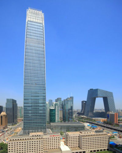 国贸三期,位于中国北京,2007年建成,高330米,74层。国贸三期由国贸中心和郭氏兄弟集团联合投资建设,投资总额约8亿美元,主体工程2008年完工。届时国贸三期不仅是北京商务中心区的标志性建筑,还将成为未来北京的标志性建筑,并且与国贸一期、二期一起构成110万平方米的建筑群,成为全球最大的国际贸易中心。目前,国贸一期的中国大饭店、国贸饭店以及二期的国贸写字楼已经成为北京CBD具有代表性的建筑。 国贸三期主塔楼总高度330米,地上层数为74层,地下4层,集现代办公楼、豪华五星级酒店、高档宴会厅和精品商场于一体,2005年6月16日动工,可抗8级地震,每15层设计一个避难层,危急时刻人员可就近躲避,楼顶还可停靠直升飞机。 因为是超高层建筑,国贸三期格外注意使用舒适度,新风量达到每人每秒12升,高于美国标准,每层办公区设有64套变风量装置,室温可任意调节,空调设备及系统末端还设有消音装置。 第十七名:武汉 中国民生银行大厦
