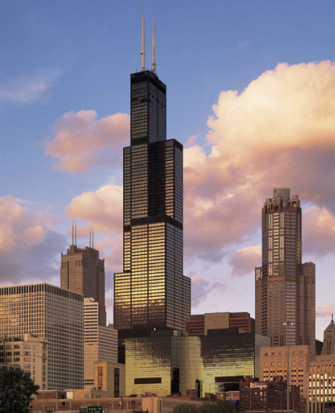 在上世纪七十年代初,高441米,共有一百一十层的双子座曾是纽约和世界最高的建筑。2001年9月11日上午九时至十一时,基地恐怖组织人员驾驶两架波音飞机将南塔北塔全部撞毁,成为本世纪最令人震惊的恐怖事件 纽约世贸中心双子座在“九•一一”恐怖袭击事件中被摧毁,造成将近四千人死亡,将南曼哈顿区的纽约金融中心变成了废墟。纽约世贸中心是以倒塌的最高摩天大楼,也是除华沙广播电塔(643米)外的最高建筑. 第五名 芝加哥 西尔斯大厦