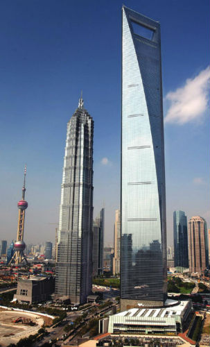 上海中心:“三足鼎立”之老三,2007年11月21日,陆家嘴股份公司发布公告称,公司拟与上海市城市建设投资开发总公司(上海城投)、上海建工集团(上海建工)合资组建项目公司开发Z3-2地块(即“上海中心”地块),分别占股45%、51%和4%,注册资本54亿元。其中,股份占到51%的上海城投成为这一项目的主导单位。同年12月,项目公司正式成立之后,由上海城投委派项目公司负责人。 事实上,目前新公司已开始运作。早报记者从新成立的“上海中心大厦建设有限公司”负责人处了解到,方案已确定,具体开工时间还不能确定。 如果“上海中心”今年年内能够成功开工,那么以工程进度而言,大楼将很可能在2010年世博会举行的一年作为上海最新的标志性建筑亮相,而陆家嘴三塔鼎立的局面也将从1993年的蓝图变成现实。目前,金茂大厦的高度为421米、环球金融中心的高度为492米,而将来的“上海中心”高度是多少呢?对此,业内人士表示:“‘上海中心’最终将是多高、又是何种式样,目前还没有明确,但高度肯定是3幢摩天大楼中最高的(650以上)。 在建第一名 :迪拜 比斯-迪拜塔
