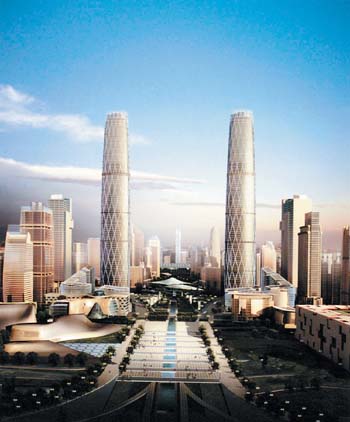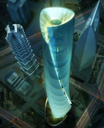 2005年6月29日,经过修订的设计图公诸于世。建筑工程于2006年4月27日开工,距离原世贸中心倒塌有四年半,比五角大厦修复完成晚了三年半。 自由塔(英语:Freedom Tower),正式名称世界贸易中心一号大楼(World Trade Center Tower 1),是兴建中的纽约新世界贸易中心的核心建筑,而它坐落的地方即是在九一一袭击事件中倒塌的原世界贸易中心双子塔楼的旧址。 自由塔的设计高度是1776英尺,象征着美国通过独立宣言的1776年,这个高度将使它超过西尔斯大厦,成为全美第一高楼,同时也是世界第一高楼。 从不同的角度观赏这座建筑物,自由塔有时看起来就像原先双子塔楼呈长方形,有些角度看起来则像个巨大的方尖碑。塔底和塔顶的墙面偏转了45度,塔身有交错的三角形切面。 与其他人期待的不同,自由塔的楼板高度仅仅有417米,总高度也只有514米自由塔因为分配给办公室和其他设施的楼层较少(顶多70层),引起了一些争议。楼层限制是西弗史丹提出的主张,他担心高的楼层可能出意外,或成为恐怖份子攻击的目标。重新设计后,自由塔定为82层,比原设计多,但仍远少于同级的高楼(连矮它一截的帝国大厦都有102层)。此外有一些建筑师不以现有的高度为满足,他们主张基于费用和工程技术等考虑,建高一点反而会更安全。 在建第四名: 广州.珠江新城双塔 广州珠江新城西塔,楼高四百三十二米,楼高位列世界第六、中国大陆第二,在世界超高层建筑占有一席之地。 西塔为广州珠江新城六大标志性建筑之一,位于珠江新城西南部核心金融商务区,东临珠江大道,西靠华厦路,南接华就路,北望花城大道,处于新城市中心的中轴线上。 该项目占地面积三点一万平方米,总建筑面积约四十五万平方米,由地下四层、地上一百零三层的主塔楼和二十八层的附楼组成,设有双酒店大堂,分别位于首层和七十层,六十九到一百层为超白金五星酒店,为国内最高的酒店,其中,九十九到一百层为观光层、餐饮层和休闲中心,并设有全国最高的游泳池。 项目投资概算六十亿元,二00五年九月,由越秀集团旗下越秀投资、城建集团、城建开发三家公司联合体中标,并组建广州越秀国际金融中心有限公司建设经营。项目二00五年底开始动工建设,将于二00九年底竣工,作为二0一0年亚运盛会配套项目交付使用。 在建第三名:香港 环球贸易广场