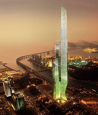 这是全球摩天楼大胆的创新的设计竞赛的一部分。图为韩国的港口城市釜山计划建设的“千年塔世界商业中心”夜景效果图。 釜山“千年塔世界商业中心”由纽约的“渐近线建筑事务所”(Asymptote Architecture)设计,高度为560米(1,837 英尺),预期于2010 年或2011年完工。“千年塔世界商业中心”建成之后,将是下一个十年亚洲最高的建筑 芝加哥“福德姆螺旋”摩天大楼