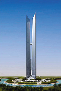 这是美国芝加哥地产发展商福德姆公司7月26日发布的“福德姆螺旋”摩天大楼(中)创意图。当日,福德姆公司宣布斥资5亿美元,兴建美国最高的摩天大楼。这座大楼由西班牙建筑师卡内特拉瓦设计,共有115层,高约609米,其独特的设计仿如一片泛着波纹的玻璃。 韩国仁川双子大楼